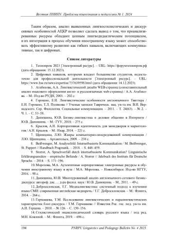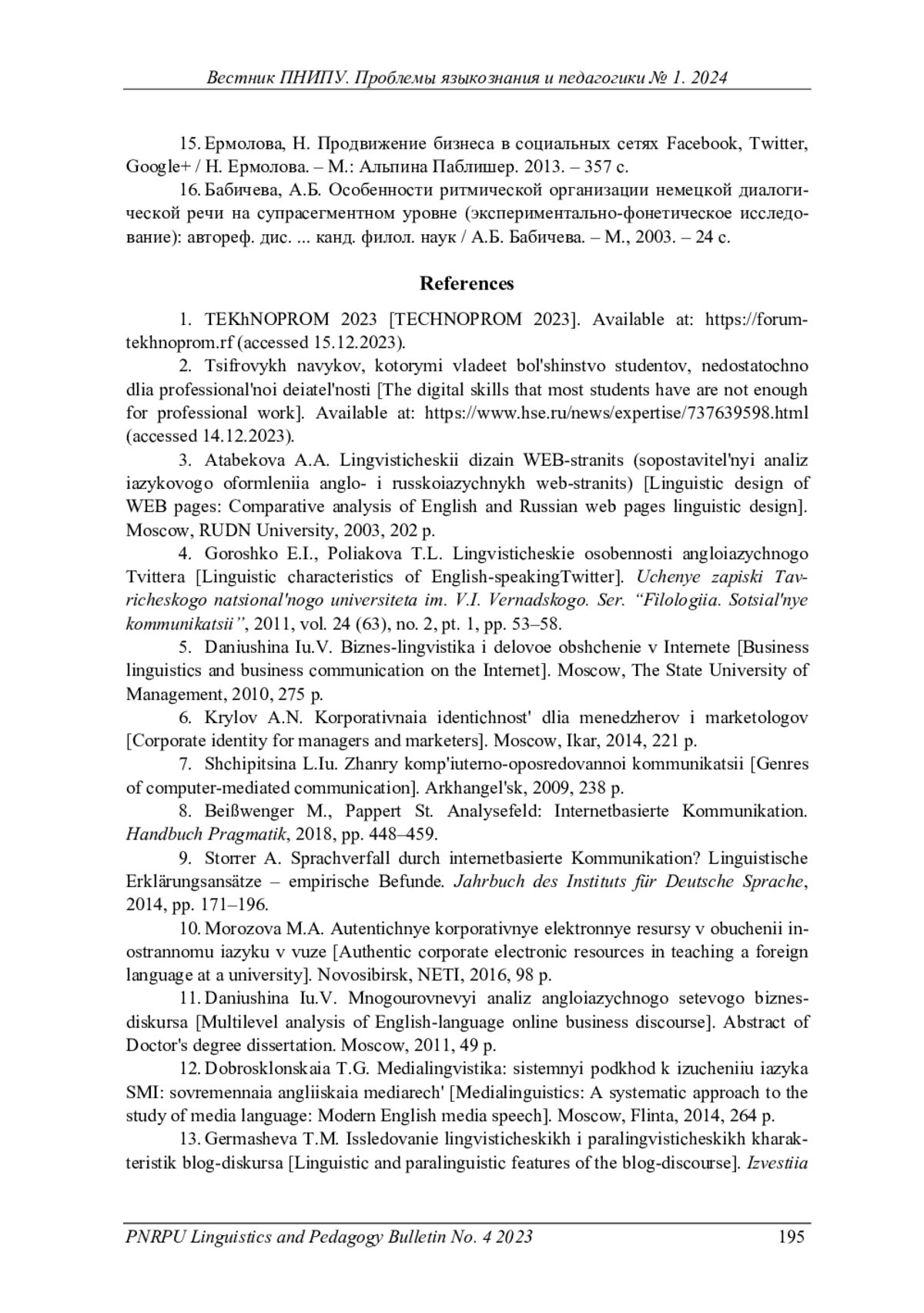 Журнал: ВЕСТНИК ПЕРМСКОГО НАЦИОНАЛЬНОГО ИССЛЕДОВАТЕЛЬСКОГО ПОЛИТЕХНИЧЕСКОГО УНИВЕРСИТЕТА. ПРОБЛЕМЫ ЯЗЫКОЗНАНИЯ И ПЕДАГОГИКИ
