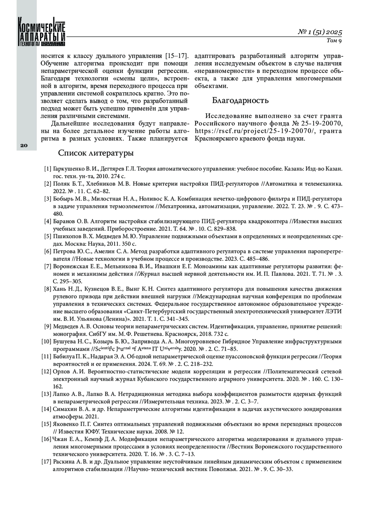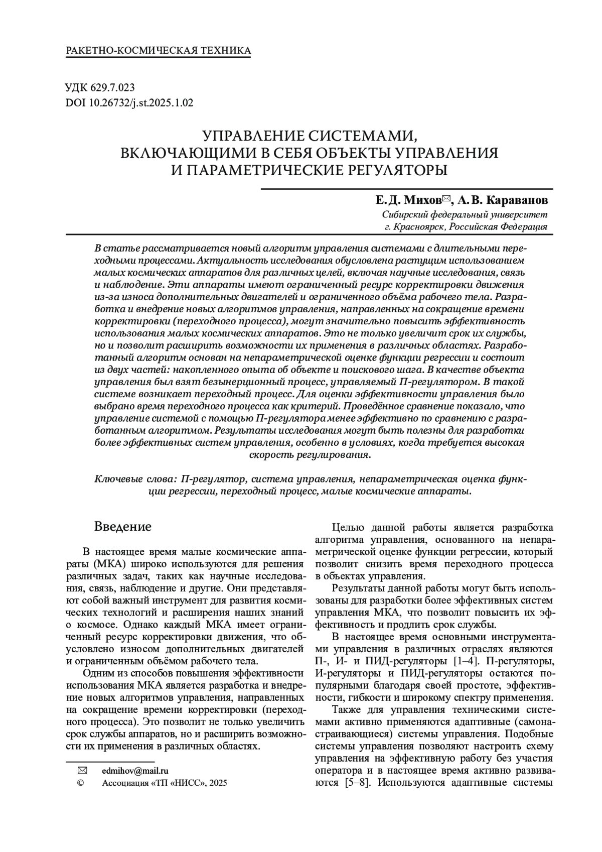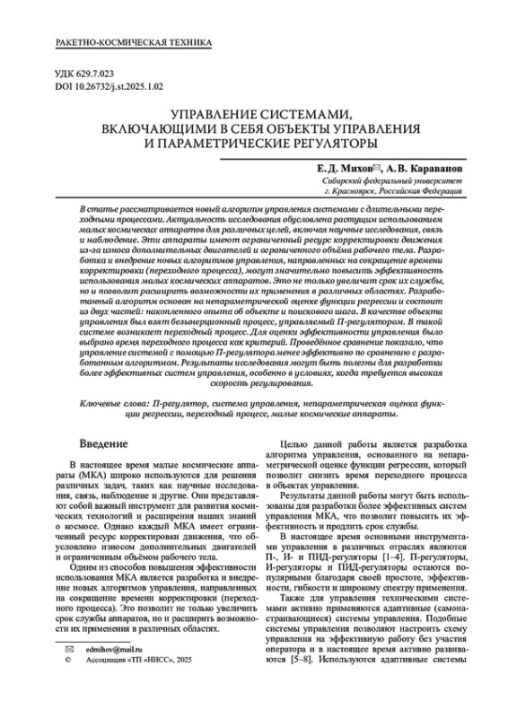 МИХОВ Е. Д., КАРАВАНОВ А. В. УПРАВЛЕНИЕ СИСТЕМАМИ, ВКЛЮЧАЮЩИМИ В СЕБЯ ОБЪЕКТЫ УПРАВЛЕНИЯ И ПАРАМЕТРИЧЕСКИЕ РЕГУЛЯТОРЫ // КОСМИЧЕСКИЕ АППАРАТЫ И ТЕХНОЛОГИИ. 2025. № 1 (51), ТОМ 9
