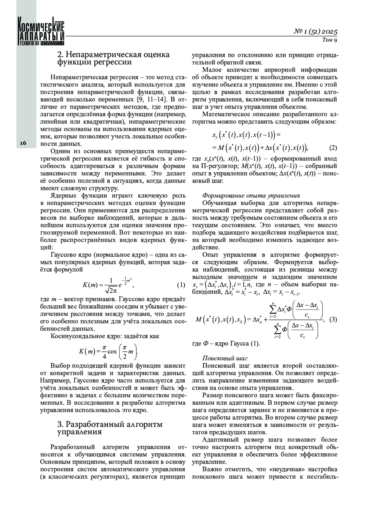 В статье рассматривается новый алгоритм управления системами с длительными переходными процессами. Актуальность исследования обусловлена растущим использованием малых космических аппаратов для различных целей, включая научные исследования, связь и наблюдение. Эти аппараты имеют ограниченный ресурс корректировки движения из-за износа дополнительных двигателей и ограниченного объёма рабочего тела. Разработка и внедрение новых алгоритмов управления, направленных на сокращение времени корректировки (переходного процесса), могут значительно повысить эффективность использования малых космических аппаратов. Это не только увеличит срок их службы, но и позволит расширить возможности их применения в различных областях. Разработанный алгоритм основан на непараметрической оценке функции регрессии и состоит из двух частей: накопленного опыта об объекте и поискового шага. В качестве объекта управления был взят безынерционный процесс, управляемый П‑регулятором. В такой системе возникает переходный процесс. Для оценки эффективности управления было выбрано время переходного процесса как критерий. Проведённое сравнение показало, что управление системой с помощью П‑регулятора менее эффективно по сравнению с разработанным алгоритмом. Результаты исследования могут быть полезны для разработки более эффективных систем управления, особенно в условиях, когда требуется высокая скорость регулирования.