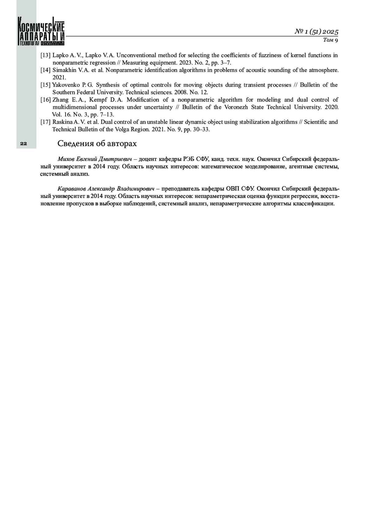 Журнал: КОСМИЧЕСКИЕ АППАРАТЫ И ТЕХНОЛОГИИ