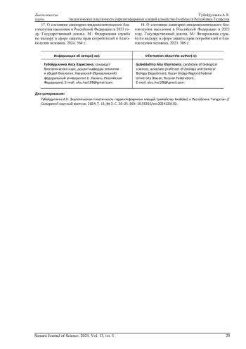 2. Губейдуллина А.Х. Видовое разнообразие и зоогеографическая характеристика паразитиформных клещей // Охрана окружающей среды и заповедное дело. 2024. Т. 5, № 1. С. 119-125. EDN: MHIDOL