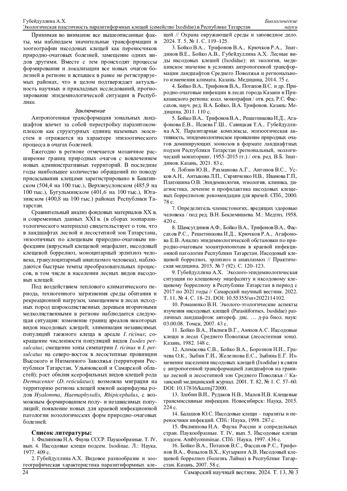 12. Алемасова С.В., Бойко В.А., Борознов Н.И., Грачева О.К., Зыбин Г.И., Железнова Е.С., Зыбина Е.Г. Изменение населения иксодовых клещей (Ixodidae) в связи с антропогенной трансформацией ландшафтов на границе лесной и лесостепной зон Среднего Поволжья // Казанский медицинский журнал. 2001. Т. 82, № 1. С. 57-60. DOI: 10.17816/kazmj72000 EDN: NIQLAK
