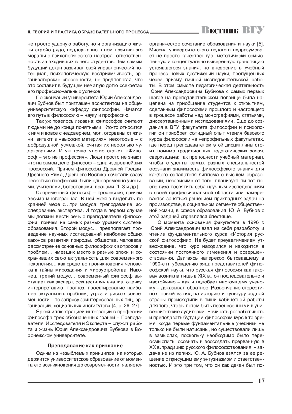 16. Бубнов Ю. А. К истокам провинциального философского образования / Ю. А. Бубнов // Вестник Воронежского государственного университета. Серия: Проблемы высшего образования. - 2022. -№ 2. - С. 76-80. EDN: PZOZXM