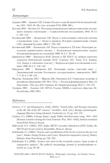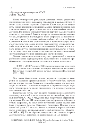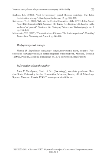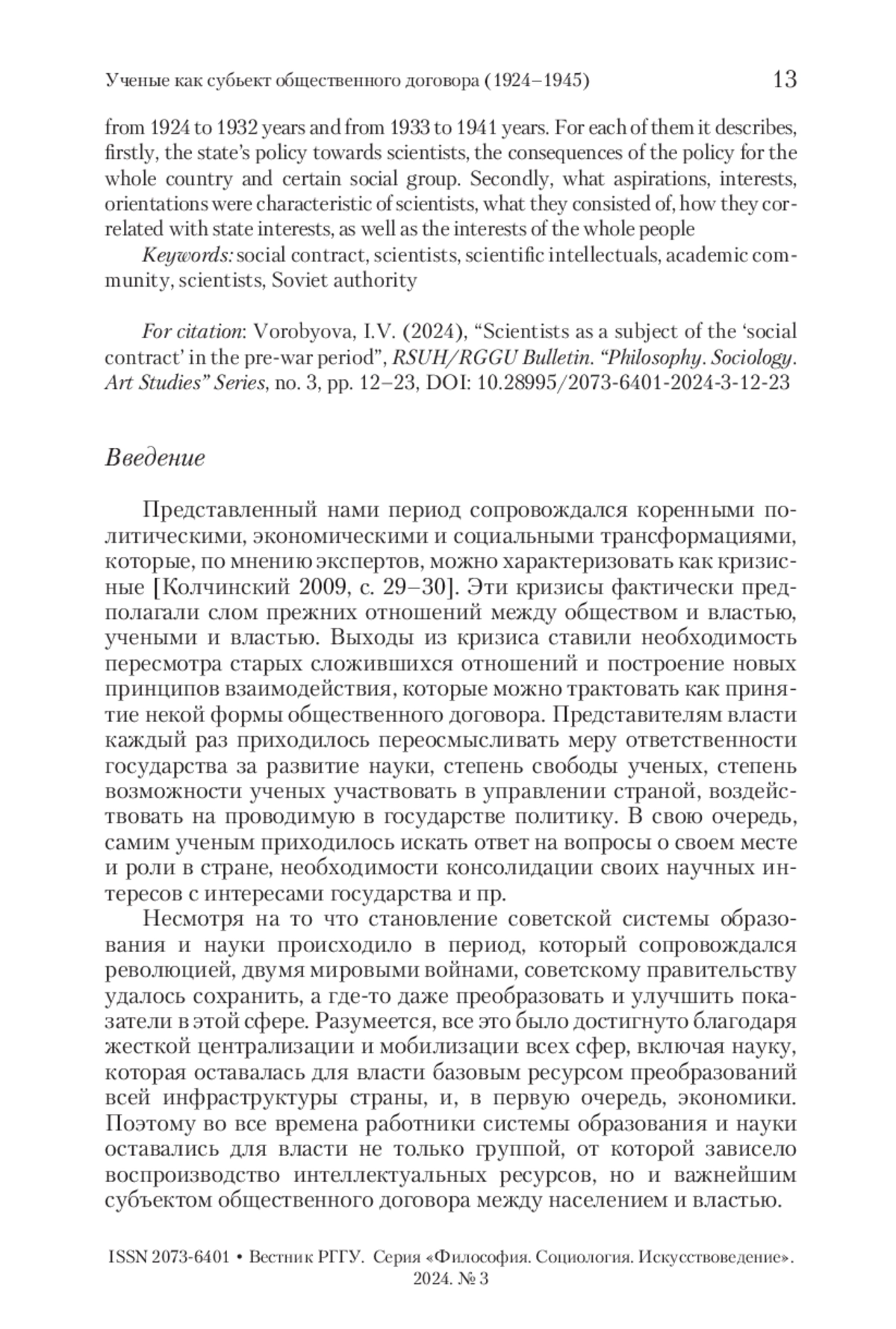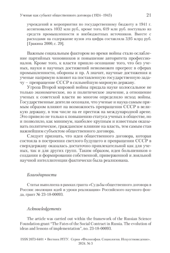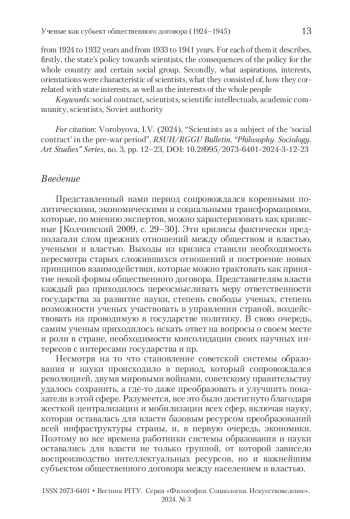 ВОРОБЬЕВА И. В. УЧЕНЫЕ КАК СУБЪЕКТ «ОБЩЕСТВЕННОГО ДОГОВОРА» В ПРЕДВОЕННЫЙ ПЕРИОД // ВЕСТНИК РГГУ. СЕРИЯ: ФИЛОСОФИЯ. СОЦИОЛОГИЯ. ИСКУССТВОВЕДЕНИЕ. 2024. № 3