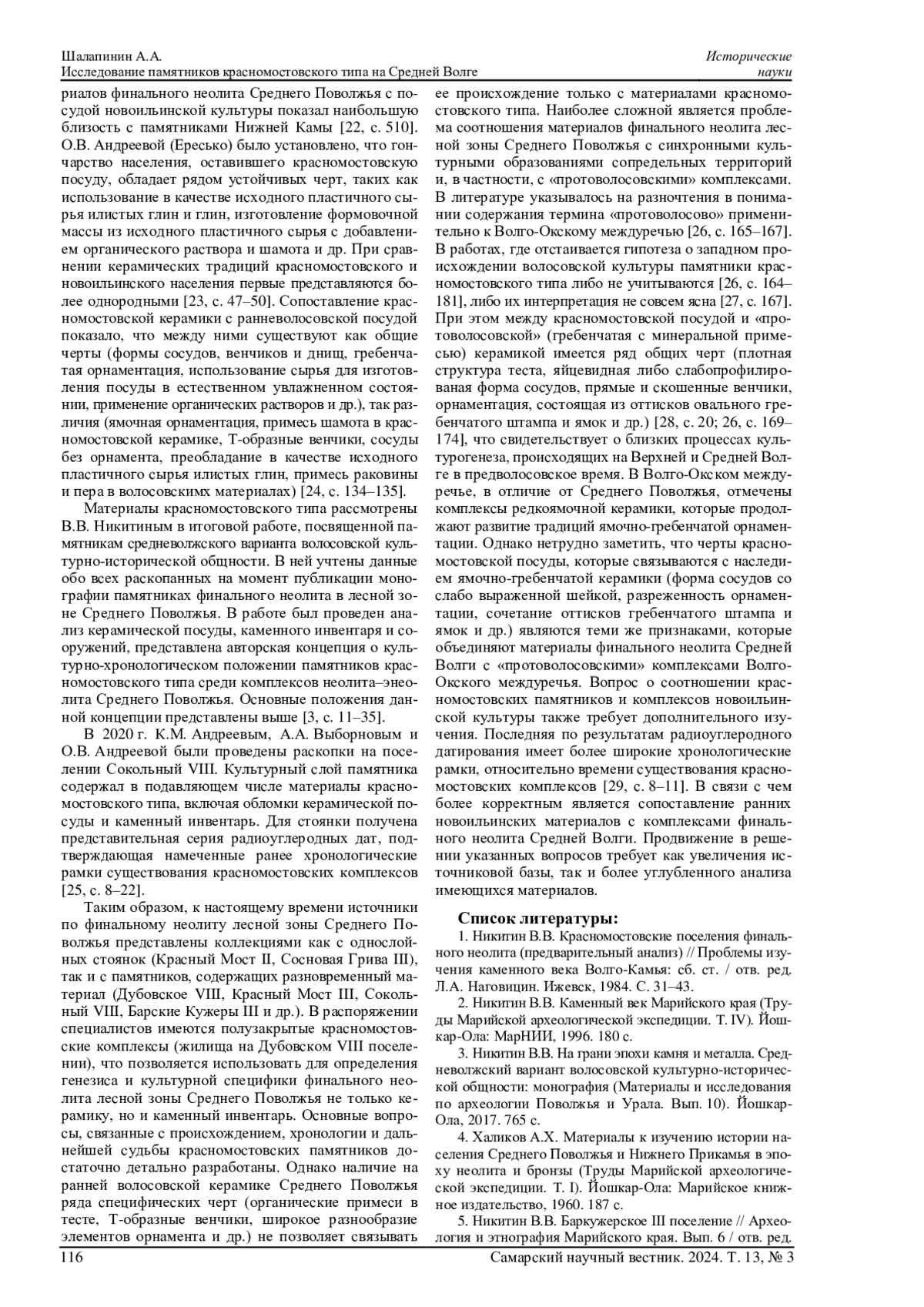 21. Кондратьев С.А., Шалапинин А.А. К проблеме хронологического соотношения комплексов позднего неолита - энеолита лесной зоны Среднего Поволжья // Известия Самарского научного центра Российской академии наук. 2011. Т. 13, № 3. С. 259-263. EDN: NXKHJH