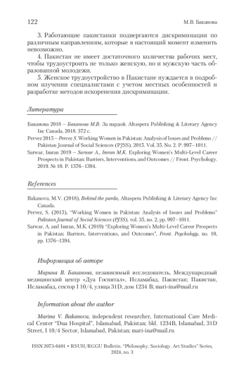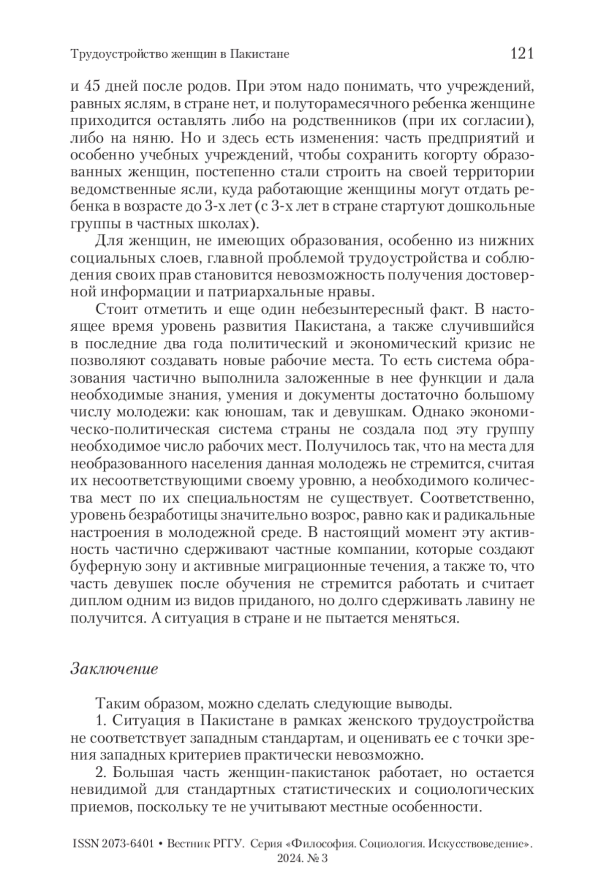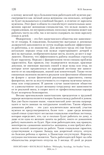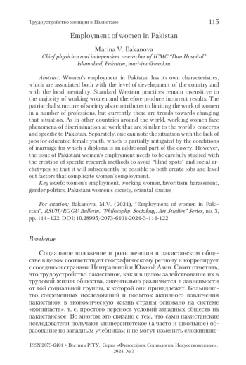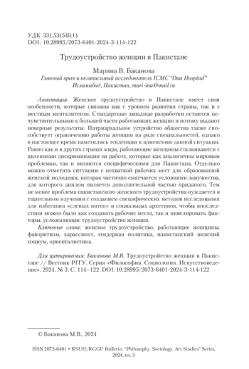БАКАНОВА М. В. ТРУДОУСТРОЙСТВО ЖЕНЩИН В ПАКИСТАНЕ // ВЕСТНИК РГГУ. СЕРИЯ: ФИЛОСОФИЯ. СОЦИОЛОГИЯ. ИСКУССТВОВЕДЕНИЕ. 2024. № 3
