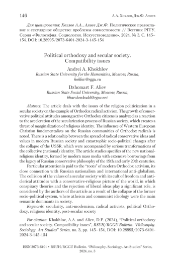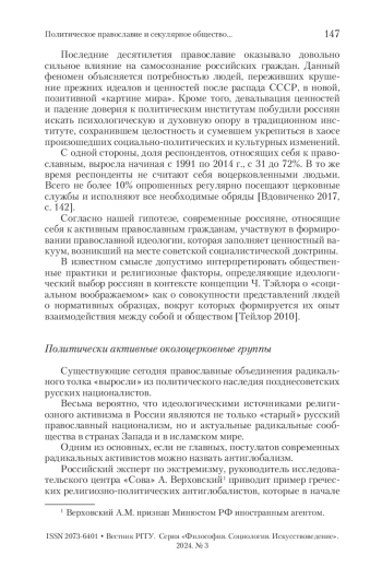 В статье рассматриваются проблемы политизации религии в светском обществе на примере православного радикального активизма. Анализируется рост консервативно-политических установок среди активных православных граждан как реакция на ускорение процесса секуляризации российского общества, что создает угрозу маргинализации религиозной идентичности. Отмечается влияние западноевропейских христианских фундаменталистов на отечественные сообщества православных радикалов. Прослеживается взаимосвязь между распространением радикально-консервативных идей и ценностей в современном российском обществе и катастрофическими социально-политическими изменениями после распада СССР, которые сопровождались серьезными трансформациями коллективной (национальной) идентичности. Исследуется особенность новой национально-религиозной идентичности, формируемой современными средствами массовой информации с обширными заимствованиями из наследия русской консервативной философии XIX и начала XX в. Особое внимание уделяется «корням» современного православного активизма, его тесной связи с русским национализмом и с международным антиглобализмом. Столкновение ценностей секулярного общества с его культом свободы и антиклерикальными установками с консервативно-религиозной картиной мира, в которой заметную роль играют конспирология и неприятие либеральных идей, рассматривается авторами статьи как результат распада прежней социально-политической системы, где атеизм и коммунистическая идеология являлись главными смысловыми доминантами в обществе.