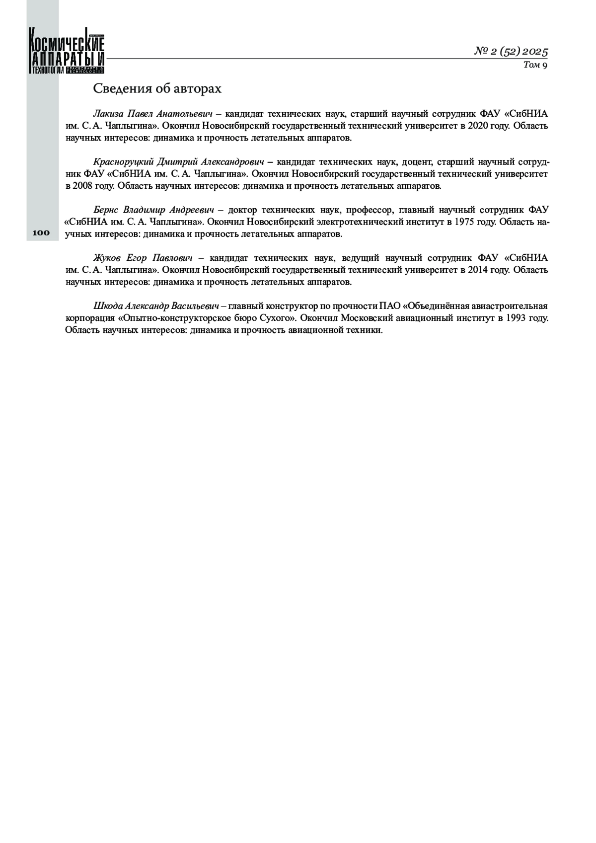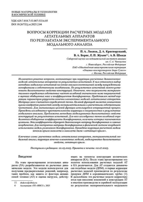 [18] Лакиза П. А. Коррекция расчетных моделей летательных аппаратов по результатам модальных испытаний: дисс. … канд. техн. наук: 2.5.14. Новосибирский государственный технический университет, Новосибирск, 2023. 162 с.