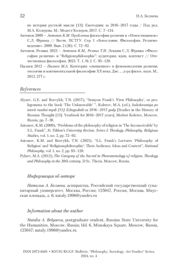 3. Антонов, Резвых 2023 - Антонов К.М., Резвых Т.Н. Лекции С.Л. Франка «Философия религии» и “Religionsphilosophie”: аудитория, идеи, контекст // Отечественная философия. 2023. Т. 1. № 2. С. 93-120.