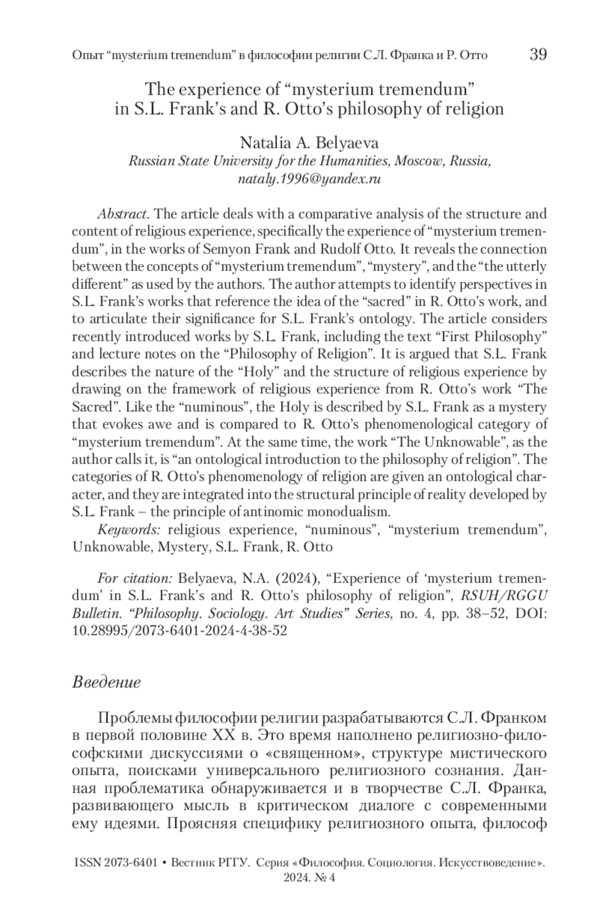 Статья посвящена сравнительному анализу структуры и содержания религиозного опыта как опыта “mysterium tremendum” у Семена Франка и Рудольфа Отто. Выявляется связь используемых авторами понятий “mysterium tremendum”, «тайна», «совершенно иное». Предпринимается попытка обнаружить в работах С. Л. Франка взгляды, отсылающие к идее «священного» у Р. Отто, сформулировать их значение для онтологии С. Л. Франка. В статье рассматриваются работы С. Л. Франка, недавно введенные в научный оборот: текст «Первая философия» и конспекты лекций «Философия религии». Автором статьи утверждается, что в «Непостижимом» С. Л. Франк описывает характер Святыни и структуру религиозного опыта, прибегая к схеме религиозного переживания из работы «Священное» Р. Отто. Подобно «нуминозному», Святыня описывается С. Л. Франком как тайна, возбуждающая трепет, и сравнивается с категорией феноменологии Р. Отто “mysterium tremendum”. При этом труд «Непостижимое», как его называет сам автор, – «опыт онтологического введения в философию религии». Категориям феноменологии религии Р. Отто придается онтологический характер, они встраиваются в разработанный С. Л. Франком структурный принцип реальности – принцип антиномистического монодуализма.