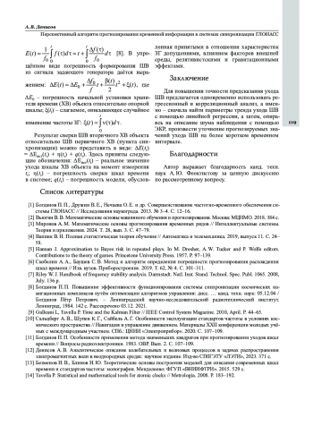 С целью повышения точности прогнозирования временной информации в системах синхронизации (эта точность, в свою очередь, зависит от математической модели, описывающей уход шкалы времени, и от точности оценок её параметров) предлагается обрабатывать временную информацию с помощью двухшагового алгоритма. На первом шаге, с целью нахождения тренда в классе линейно или параболически изменяющихся функций, используется метод максимального правдоподобия, который может быть реализован с учётом апостериорной вероятности. На втором шаге, после выделения тренда ухода шкалы времени, предлагается прогнозировать шум наблюдения методом наименьших квадратов (который можно дополнить L2-регуляризацией), где в качестве базисных предложено использовать тригонометрические функции. Оптимальный выбор периода первой гармоники и кратности учитываемых гармоник в разложении шума наблюдения осуществляется с помощью его приближённого канонического разложения по тригонометрическим функциям со случайными коэффициентами. Эти параметры, а также дисперсии случайных коэффициентов разложения находятся в соответствии с оценённой на интервале наблюдения спектральной плотностью мощности шума наблюдения и с заданной точностью воспроизведения его дисперсии. Показано преимущество приближённого канонического разложения шума наблюдения в сравнении со строгим ортогональным разложением Карунена–Лоэва. В работе обоснован оптимальный выбор интервалов наблюдения и прогнозирования.