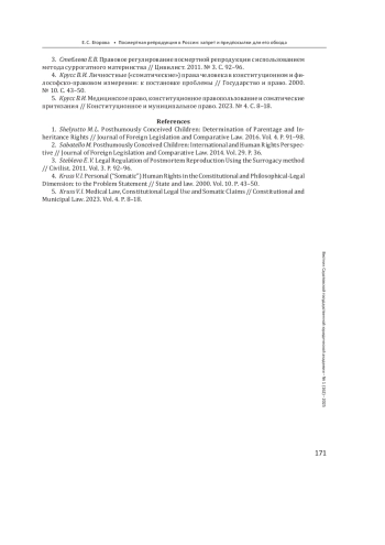 3. Стеблева Е. В. Правовое регулирование посмертной репродукции с использованием метода суррогатного материнства // Цивилист. 2011. № 3. С. 92-96. EDN: NYBXBR