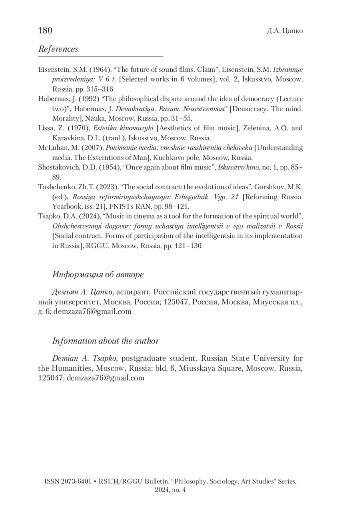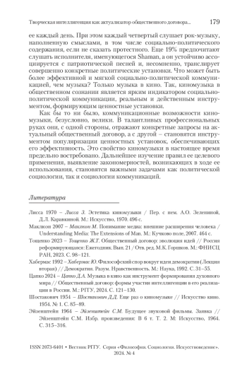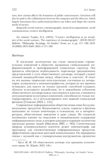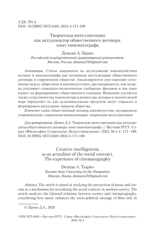 ЦАПКО Д. А. ТВОРЧЕСКАЯ ИНТЕЛЛИГЕНЦИЯ КАК АКТУАЛИЗАТОР ОБЩЕСТВЕННОГО ДОГОВОРА: ОПЫТ КИНЕМАТОГРАФА // ВЕСТНИК РГГУ. СЕРИЯ: ФИЛОСОФИЯ. СОЦИОЛОГИЯ. ИСКУССТВОВЕДЕНИЕ. 2024. № 4