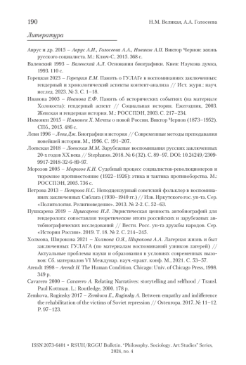 3. Горецкая 2023 - Горецкая Е.М. Память о ГУЛАГе в воспоминаниях заключенных: гендерный и хронологический аспекты контент-анализа // Ист. журн.: науч. исслед. 2023. № 3. С. 1-18.