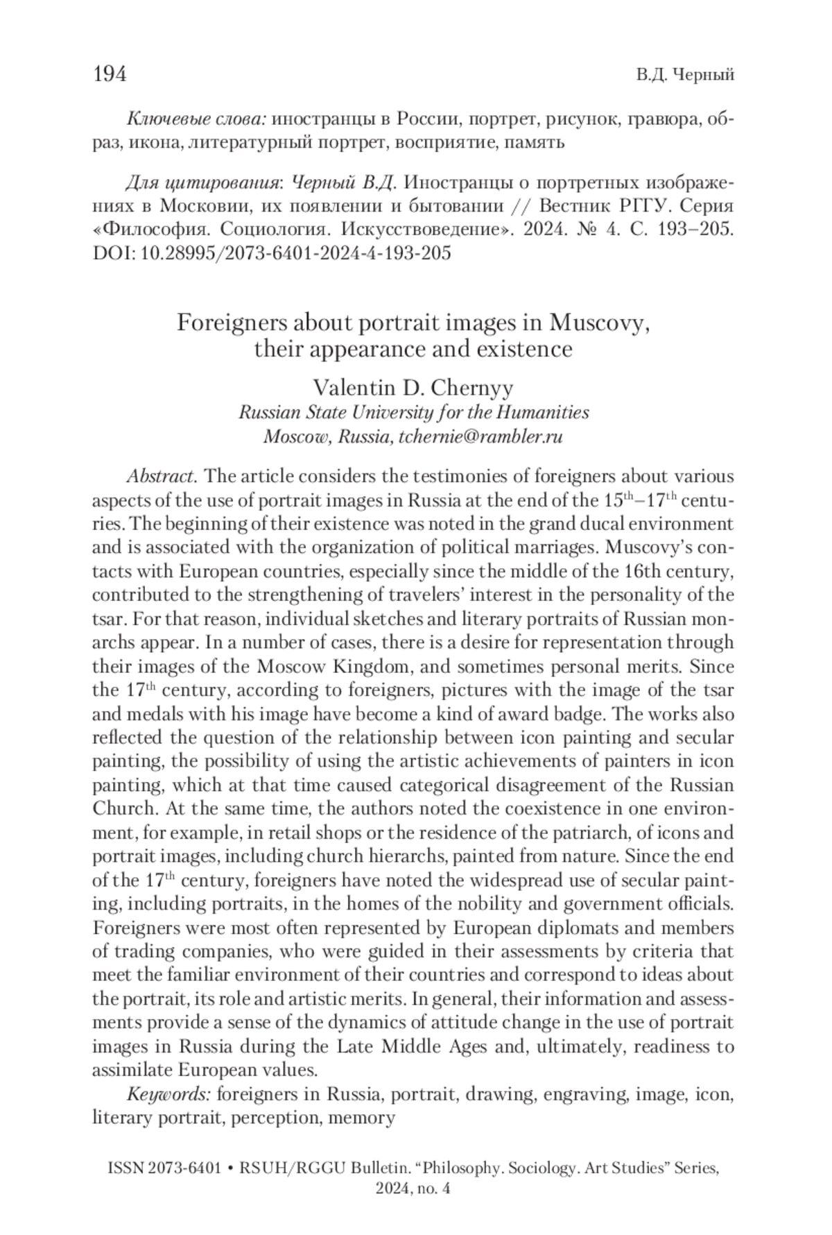 В статье рассматриваются свидетельства иностранцев о различных аспектах использования портретных изображений в России конца XV – XVII в. Начало их бытования отмечено в великокняжеской среде и связано с организацией политических браков. Контакты Московии с европейскими странами, особенно с середины XVI в., способствовали усилению интереса путешественников к личности царя. По этой причине появляются отдельные зарисовки и литературные портреты русских монархов. В ряде случает отмечается стремление к репрезентации через их изображения Московского царства, а иногда и личных заслуг. С XVII в., по свидетельству иностранцев, картинки с изображением царя и медали с его образом становятся своего рода наградными знаками. В сочинениях нашел отражение и вопрос о взаимоотношениях иконописи и светской живописи, о возможности использовать художественные достижения живописцев в иконописании, что в этот период вызывало категорическое несогласие Русской церкви. Одновременно авторы отмечали сосуществование в одной среде, например в торговых лавках или резиденции патриарха, икон и портретных изображений, в том числе церковных иерархов, написанных с натуры. С конца XVII столетия иностранцы отмечают широкое использование в домах знати и государственных чиновников светской живописи, в том числе портретов. Иностранцами чаще всего являлись европейские дипломаты и члены торговых компаний, которые руководствовались в своих оценках критериями, отвечающими привычной обстановке своих стран и соответствующими представлениям о портрете, его роли и художественных достоинствах. В целом их сведения и оценки позволяют почувствовать динамику изменения отношения в использовании портретных изображений в России в период Позднего Средневековья и в конечном счете готовность к усвоению европейских ценностей.