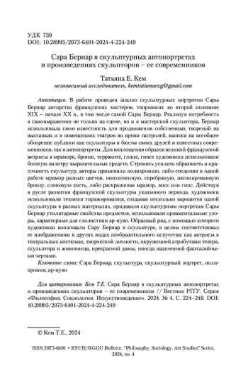 В работе проведен анализ скульптурных портретов Сары Бернар авторства французских мастеров, творивших во второй половине XIX – начале ХХ в., в том числе самой Сары Бернар. Реализуя потребность в самовыражении не только на сцене, но и в мастерской скульптора, Бернар использовала свою известность для продвижения собственных творений на выставках и в помещениях театров во время гастролей, вынося на всеобщее обозрение публики как скульптуры и бюсты своих друзей и известных современников, так и автопортреты. Для воплощения образов великой французской актрисы в мраморе, бронзе, терракоте, глине, гипсе художники использовали богатую палитру выразительных средств. Стремясь усилить образность и красочность скульптур, авторы применяли полихромию, либо соединяя в одной работе мрамор разных цветов, позолоченную, серебряную, патинированную бронзу, слоновую кость, либо раскрашивая мрамор, воск или гипс. Действуя в русле развития французской скульптуры указанного периода, художники использовали техники тиражирования, создавая несколько вариантов одной скульптуры в разных материалах, придавали скульптурным портретам Сары Бернар утилитарные свойства предметов, использовали орнаментальные узоры, характерные для стилистики ар-нуво. Образный ряд, с помощью которого художники воплощали Сару Бернар в скульптуре, в целом соответствовал ее изображениям в других видах изобразительного искусства: как актрисы в театральных костюмах, творческой личности, окруженной атрибутами театра, скульптора и живописца, прекрасной дамы, иногда наделенной фантазийными чертами.