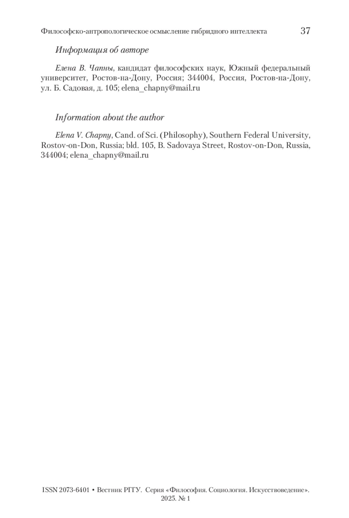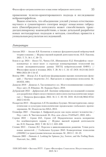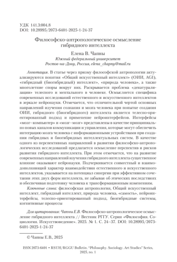 В статье через призму философской антропологии актуализируются понятия «Общий искусственный интеллект» (ОИИ, AGI), «гибридный (биогибридный) интеллект», «природа человека», а также многолетние споры вокруг них. Раскрывается проблема «денатурализации» телесного и ментального в человеке. Осмысляется специфика современных исследований естественного и искусственного интеллектов в зеркале нейронауки. Отмечается, что отличительной чертой основных направлений изучения сознания и мозга человека при попытке создания ОИИ, гибридного (биогибридного) интеллекта является телесно-ориентированный подход и применение нейроинтерфейсов. Интерфейсы «мозг–компьютер» и «мозг–мозг» представлены в качестве принципиально новых каналов коммуникации и управления, которые могут обеспечить интеграцию мозга человека с информационными устройствами при создании гибридных и биогибридных интеллектуальных систем. В качестве одного из перспективных направлений в развитии философско-антропологических исследований предлагается осмысление перспектив и рисков развития гибридного интеллекта. При этом отмечается, что на развитие современных направлений изучения гибридного интеллекта существенное влияние оказывают нейронауки. Подчеркивается совместный и взаимодополняющий характер взаимодействия естественного и искусственного интеллектов, указывается на потенциал синергии при эффективном сочетании этих двух форм интеллекта, не забывая об этических последствиях и обеспечивая подготовку человека к трансформационным изменениям.