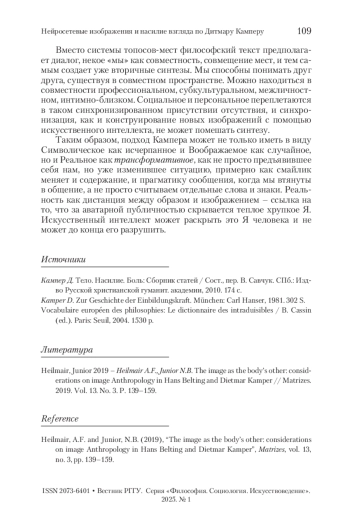 1. Heilmair, Junior 2019 - Heilmair A.F., Junior N.B. The image as the body’s other: considerations on image Anthropology in Hans Belting and Dietmar Kamper // Matrizes. 2019. Vol. 13. No. 3. P. 139-159.