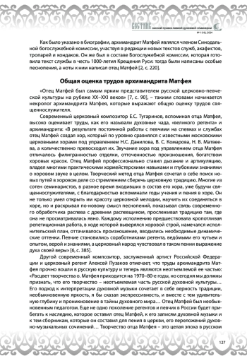 Настоящее исследование выполнено в контексте изучения русской религиозной музыки и церковного пения со стороны светского учебного заведения. Архимандрит Матфей (Мормыль), бывший знаменитый регентом во второй половине ХХ - в нач. XXI столетия, вошел в историй русской культуры и музыки и повлиял на церковное пение. В работе рассматриваются труды пастыря, изменение литургической жизни благодаря его регентской деятельности. Также приведены общие оценки современников трудов отца Матфея.
