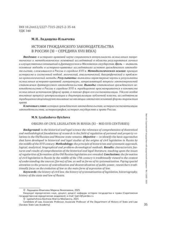 48. Кодан С. В. Развитие системы российского права: основания и процесс создания юридической конструкции построения нормативного материала (IX - середина XVII века) // Юридическая техника. 2013. № 7, ч. 2. С. 297-308. EDN: RBRSHJ