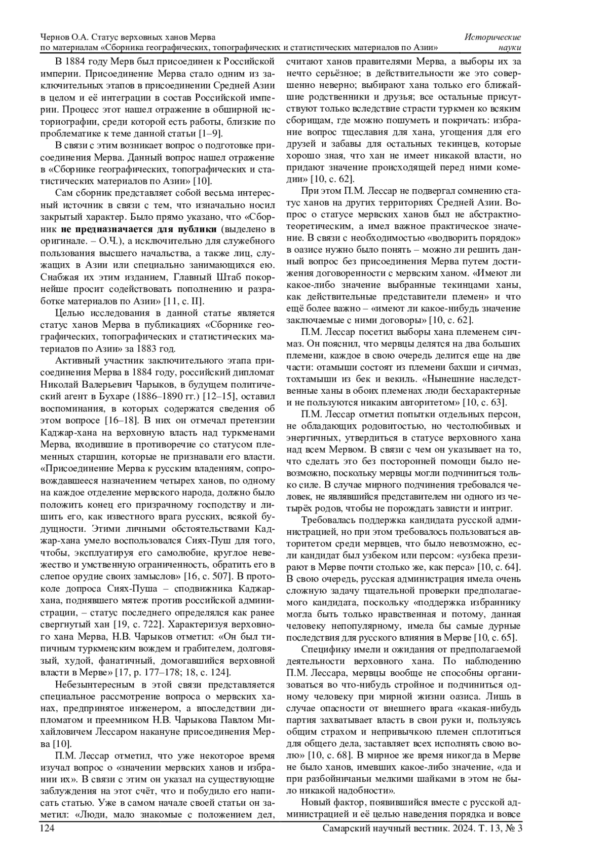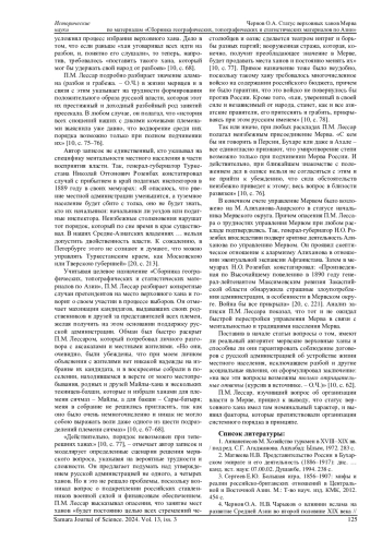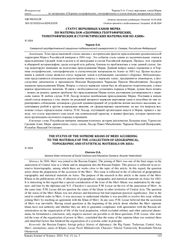 Тема представленной статьи связана с историческим фактом присоединения среднеазиатской территории Мерв к Российской империи в 1884 году. Это событие стало одним из заключительных этапов в присоединении Средней Азии в целом и её интеграции в состав Российской империи. Процесс этот отражён в обширной историографии, среди которой есть работы, близкие по проблематике к теме данной статьи. Автор акцентирует внимание на подготовке присоединения Мерва. Данный вопрос нашел отражение в «Сборнике географических, топографических и статистических материалов по Азии» за 1883 год. Целью исследования в данной статье является статус мервских ханов в публикациях указанного сборника. Небезынтересным представляется специальное рассмотрение вопроса о мервских ханах, предпринятое инженером, а впоследствии дипломатом и преемником Николая Валерьевича Чарыкова Павлом Михайловичем Лессаром накануне присоединения Мерва. Вопрос о статусе мервских ханов был не абстрактно-теоретическим, а имел важное практическое значение. В связи с необходимостью установить порядок в Мерве, нужно было понять - можно ли решить данную проблему без присоединения Мерва путем достижения договоренности с мервским ханом. В любом случае П. М. Лессар полагал неизбежным присоединение Мерва. Поставив в начале своей статьи вопросы о том, имеют ли реальный авторитет мервские верховные ханы и способны ли они гарантировать соблюдение договоров с русской администрацией об устройстве жизни местного населения, исключавшем разбой и другие асоциальные явления, он сформулировал заключение: на все эти вопросы возможны только отрицательные ответы. П. М. Лессар, изучивший организацию власти в Мерве, пришел к выводу, что статус верховного хана носит там номинальный характер, и выявил факторы, которые препятствовали организации системного порядка в принципе.