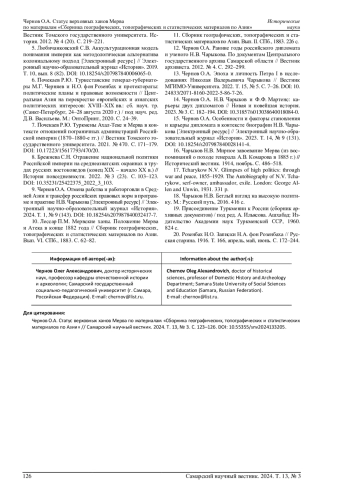 12. Чернов О.А. Ранние годы российского дипломата и ученого Н.В. Чарыкова. По документам Центрального государственного архива Самарской области // Вестник архивиста. 2012. № 4. С. 292-299. EDN: QDFKIH