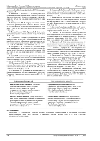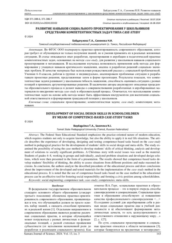 БАЙДАГУЛОВА Т. А., САЗОНОВА Н. И. РАЗВИТИЕ НАВЫКОВ СОЦИАЛЬНОГО ПРОЕКТИРОВАНИЯ У ШКОЛЬНИКОВ СРЕДСТВАМИ КОМПЕТЕНТНОСТНЫХ ЗАДАЧ ТИПА CASE-STUDY // САМАРСКИЙ НАУЧНЫЙ ВЕСТНИК. 2024. ТОМ 13, № 3