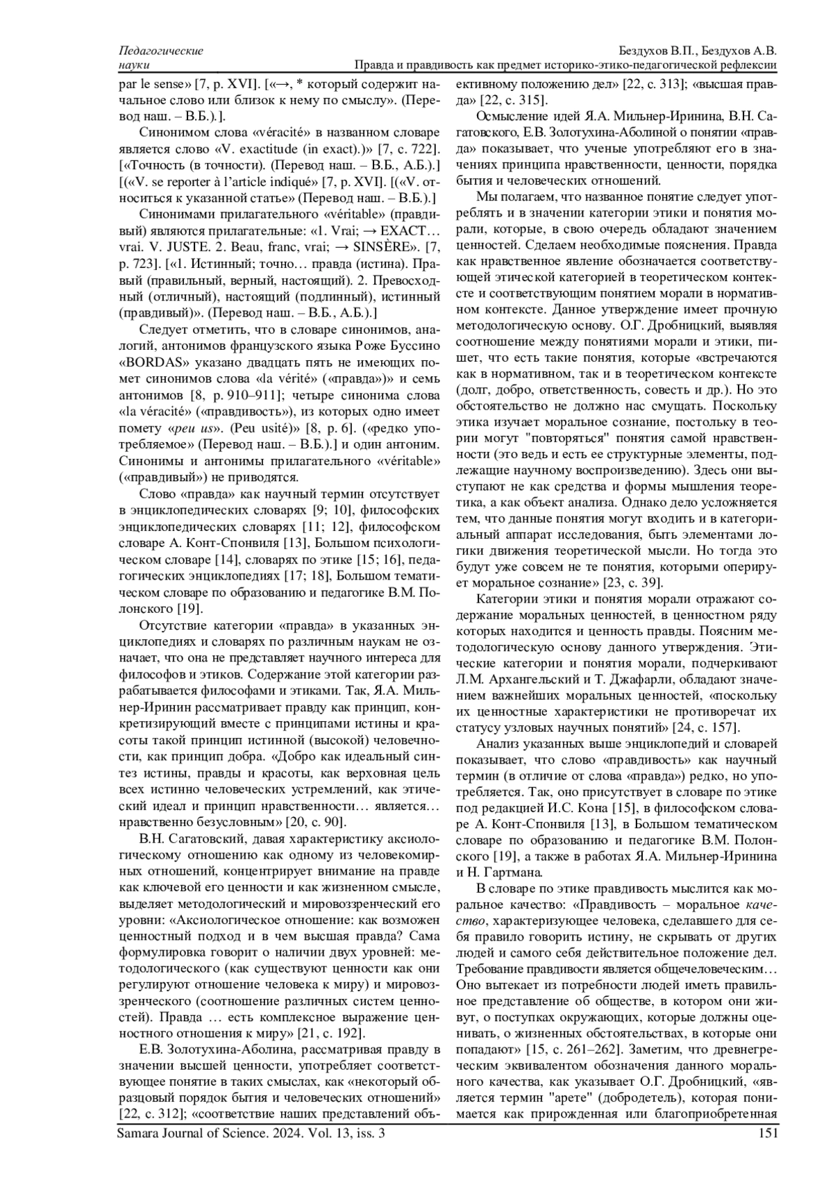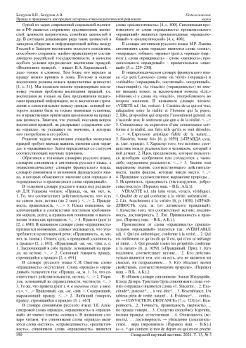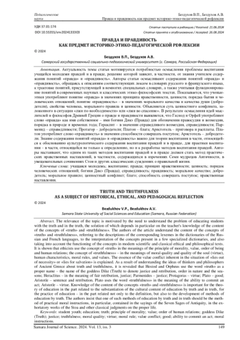 Актуальность темы статьи мотивируется потребностью осмысления проблемы воспитания учащейся молодежи правдой и в правде, решение которой зависит, в частности, от знания учителем содержания понятий «правда» и «правдивость». Авторы статьи осмысливают содержания понятий «правда» и «правдивость», обращаясь к описаниям соответствующих лексем в словарях русского и французского языка, к трактовке понятий, присутствующей в немногих специальных словарях, а также учитывая функционирование понятий в современных научных и классических этико-философских текстах. Показывается, что ученые-этики употребляют понятие «правда» в значениях принципа нравственности, ценности, порядка бытия и человеческих отношений; понятие «правдивость» - в значениях морального качества и качества души (добродетели), свойства человека, морального правила и ценности. Объясняется суть ценностного конфликта, заложенного в ситуации «лжи по необходимости» или «лжи во спасение». В результате осмысления идей мыслителей и философов Древней Греции о правде и правдивости выявляется, что Гесиод и Орфей употребляют слово «правда» как имя собственное - имя богини Дикэ (Правда) для обозначения правосудия и возмездия, порядка в природе и временах года; Гераклит - в значении справедливого возмездия, справедливости; Парменид - справедливости; Протагор - добродетели; Платон - блага; Аристотель - приговора и расплаты. Платон употребляет слово «правдивость» в значении способности совершать поступок; Аристотель - добродетели. Знание содержания понятий «правда» и «правдивость» важно для теории воспитания в части, относящейся к обоснованию культурологического содержания воспитания правдой и в правде, для практики воспитания - в части, относящейся не только к определению, но и к разработке методов воспитания правдой. Авторы настаивают, что одним из таких методов воспитания правдой и в правде должен стать метод практических нравственных наставлений, в частности, содержащихся в изречениях Семи мудрецов Античности, в увещевательных сочинениях Стои и других классических суждениях о правильной жизни.