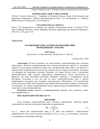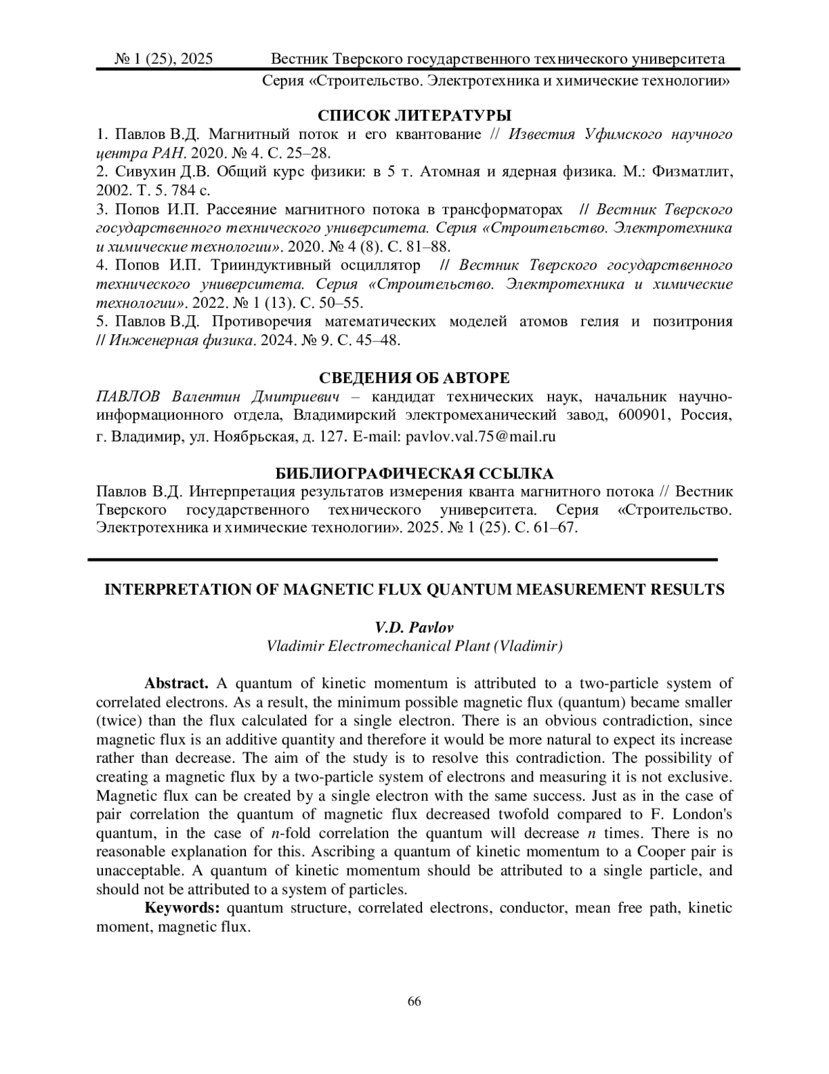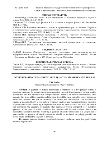 1. Павлов В.Д. Магнитный поток и его квантование // Известия Уфимского научного центра РАН. 2020. № 4. С. 25-28. EDN: TQTBEO