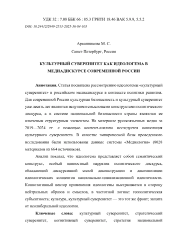 Статья посвящена рассмотрению идеологемы «культурный суверенитет» в российском медиадискурсе в контексте политики развития. Для современной России культурная безопасность и культурный суверенитет уже десять лет являются ведущими смысловыми конструктами политического дискурса, а в системе национальной безопасности страны являются ее ключевым структурным элементом. На материале русскоязычных медиа за 2019—2024 гг. с помощью контент-анализа исследуется коннотация культурного суверенитета. В качестве эмпирической базы проведенного исследования были использованы данные системы «Медиалогия» (8028 материалов из 664 источников).