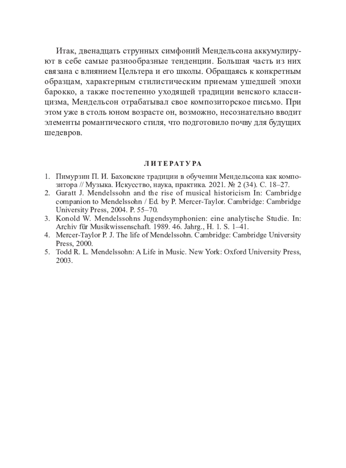 1. Пимурзин П. И. Баховские традиции в обучении Мендельсона как композитора // Музыка. Искусство, наука, практика. 2021. № 2 (34). С. 18–27.