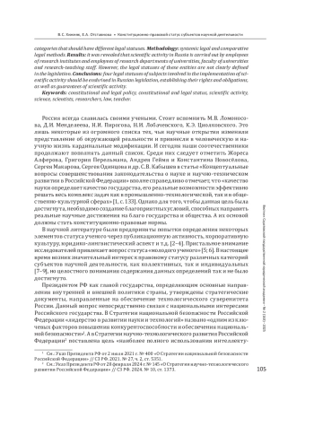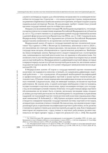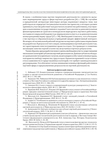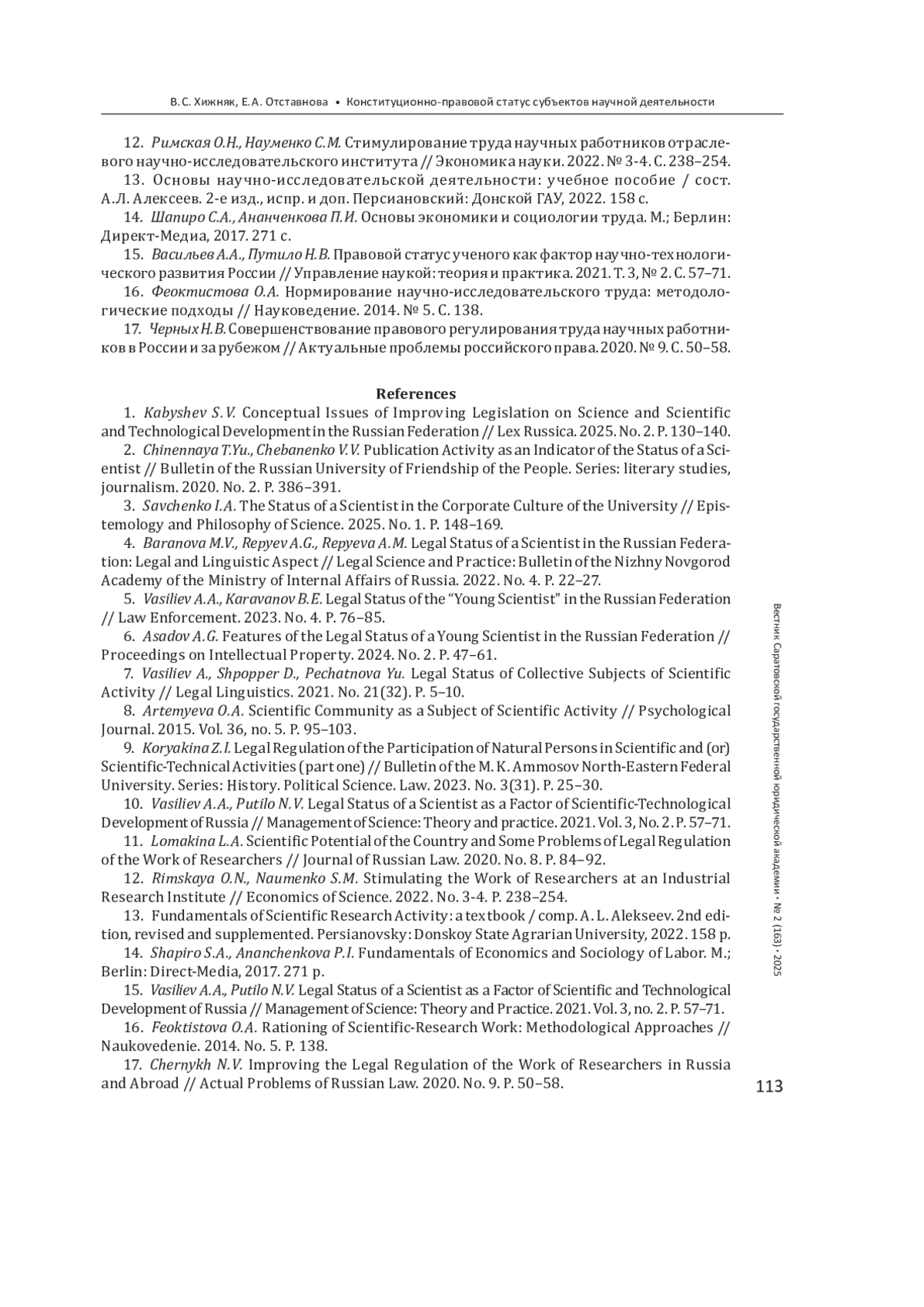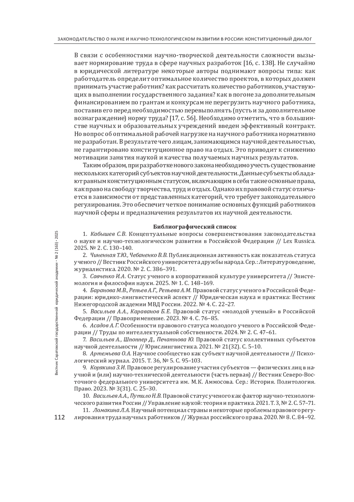 1. Кабышев С. В. Концептуальные вопросы совершенствования законодательства о науке и научно-технологическом развитии в Российской Федерации // Lex Russica. 2025. № 2. С. 130-140.