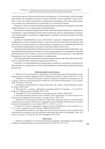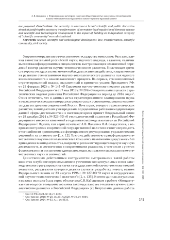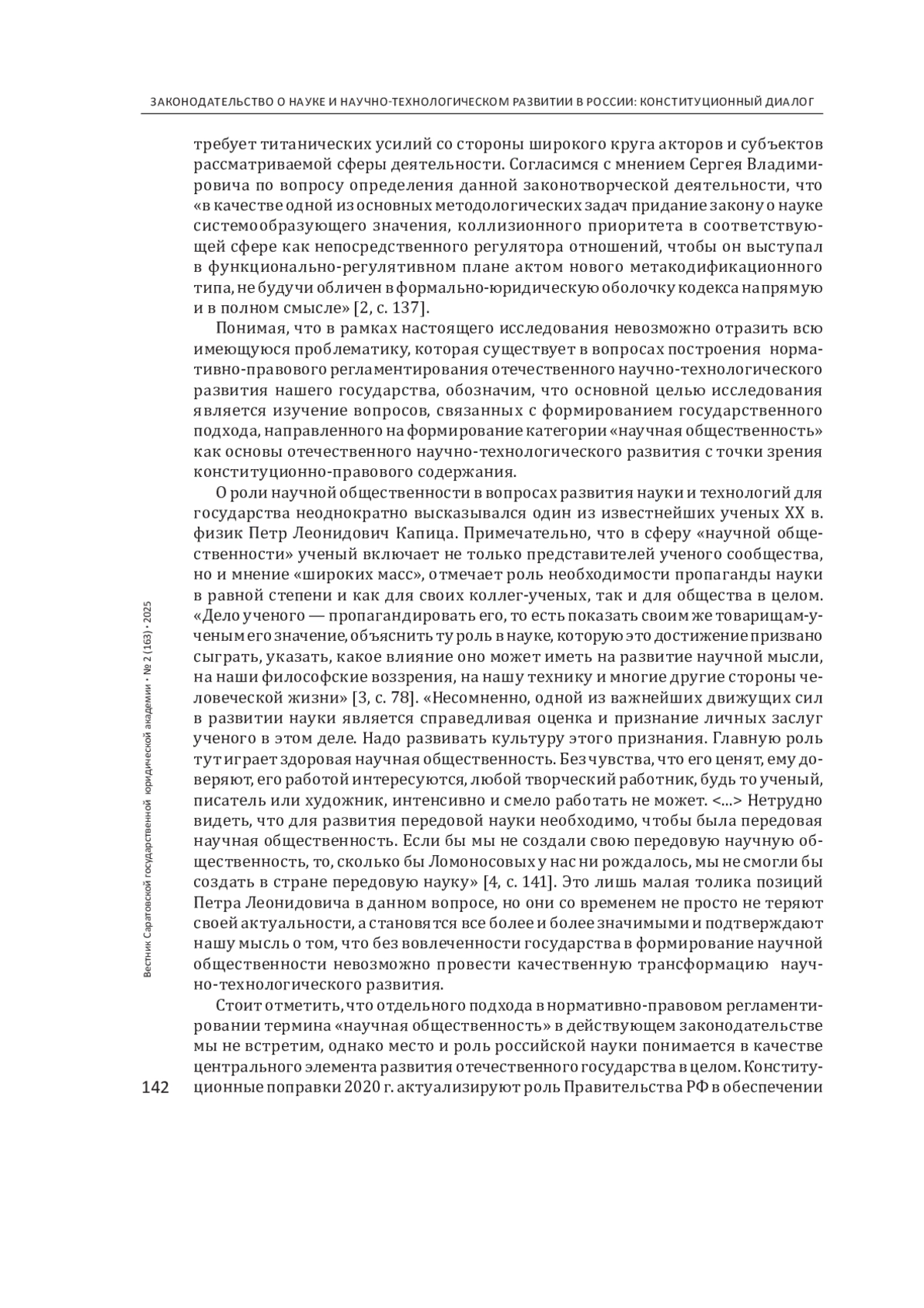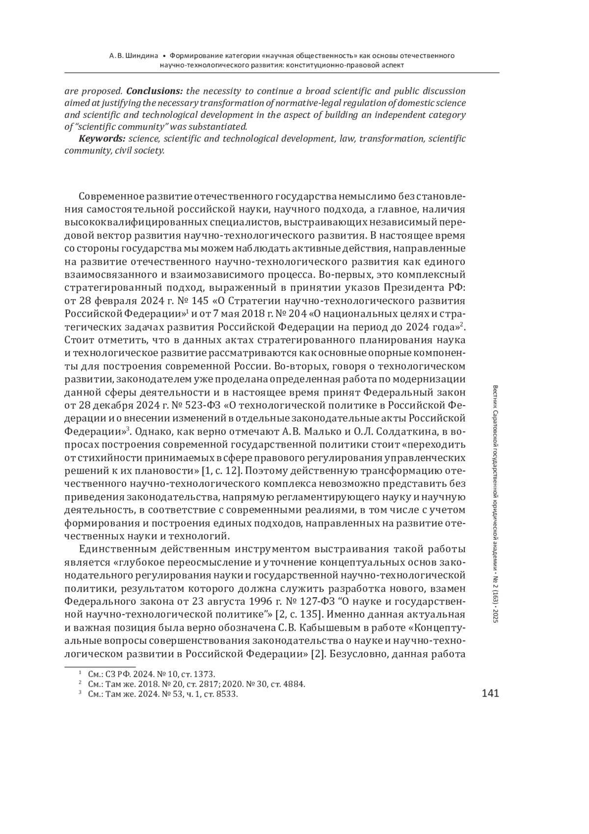 ШИНДИНА А. В. ФОРМИРОВАНИЕ КАТЕГОРИИ «НАУЧНАЯ ОБЩЕСТВЕННОСТЬ» КАК ОСНОВЫ ОТЕЧЕСТВЕННОГО НАУЧНО-ТЕХНОЛОГИЧЕСКОГО РАЗВИТИЯ: КОНСТИТУЦИОННО-ПРАВОВОЙ АСПЕКТ // ВЕСТНИК САРАТОВСКОЙ ГОСУДАРСТВЕННОЙ ЮРИДИЧЕСКОЙ АКАДЕМИИ. 2025. № 2 (163)