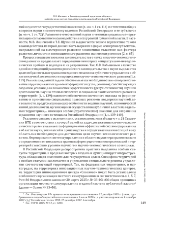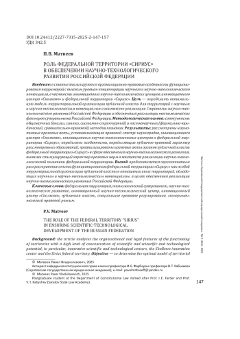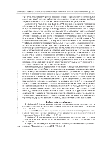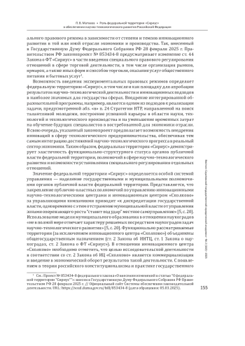 Вывод: представляется перспективным распространение опыта функционирования федеральной территории «Сириус» как особой территориальной организации публичной власти в отношении иных территорий, обладающих научным и научно-технологическим потенциалом, в целях обеспечения реализации научно-технологического развития Российской Федерации.