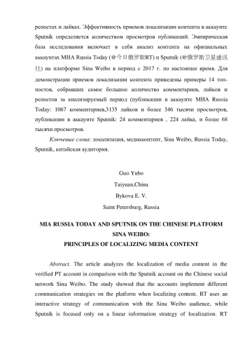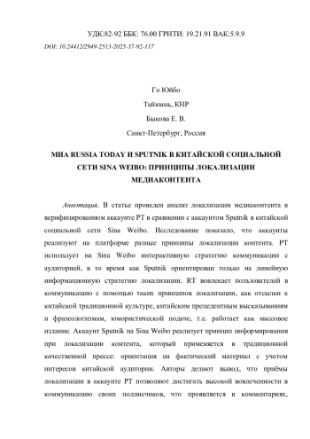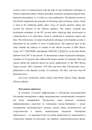 В статье проведен анализ локализации медиаконтента в верифицированном аккаунте PT в сравнении с аккаунтом Sputnik в китайской социальной сети Sina Weibo. Исследование показало, что аккаунты реализуют на платформе разные принципы локализации контента. PT использует на Sina Weibo интерактивную стратегию коммуникации с аудиторией, в то время как Sputnik ориентирован только на линейную информационную стратегию локализации. RT вовлекает пользователей в коммуникацию с помощью таких принципов локализации, как отсылки к китайской традиционной культуре, китайским прецедентным высказываниям и фразеологизмам, юмористической подаче, т. е. работает как массовое издание. Аккаунт Sputnik на Sina Weibo реализует принцип информирования при локализации контента, который применяется в традиционной качественной прессе: ориентация на фактический материал с учетом интересов китайской аудитории. Авторы делают вывод, что приёмы локализации в аккаунте PT позволяют достигать высокой вовлеченности в коммуникацию своих подписчиков, что проявляется в комментариях, репостах и лайках. Эффективность приемов локализации контента в аккаунте Sputnik определяется количеством просмотров публикаций. Эмпирическая база исследования включает в себя анализ контента на официальных аккаунтах МИА Russia Today (@今日俄罗斯RT) и Sputnik (@俄罗斯卫星通讯社) на платформе Sina Weibo в период с 2017 г. по настоящее время. Для демонстрации приемов локализации контента приведены примеры 14 топ-постов, собравших самое большое количество комментариев, лайков и репостов за анализируемый период (публикации в аккаунте МИА Russia Today: 1067 комментариев,3135 лайков и более 346 тысячи просмотров, публикации в аккаунте Sputnik: 24 комментариев, 224 лайка, и более 68 тысячи просмотров.