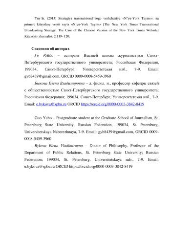 20. Юй Ин. Стратегия транснационального вещания “Нью-Йорк Таймс”: на примере китайской версии сайта “Нью-Йорк Таймс” // Журнал “Китайский журналист”, 2013, № 02. С. 119- 120.