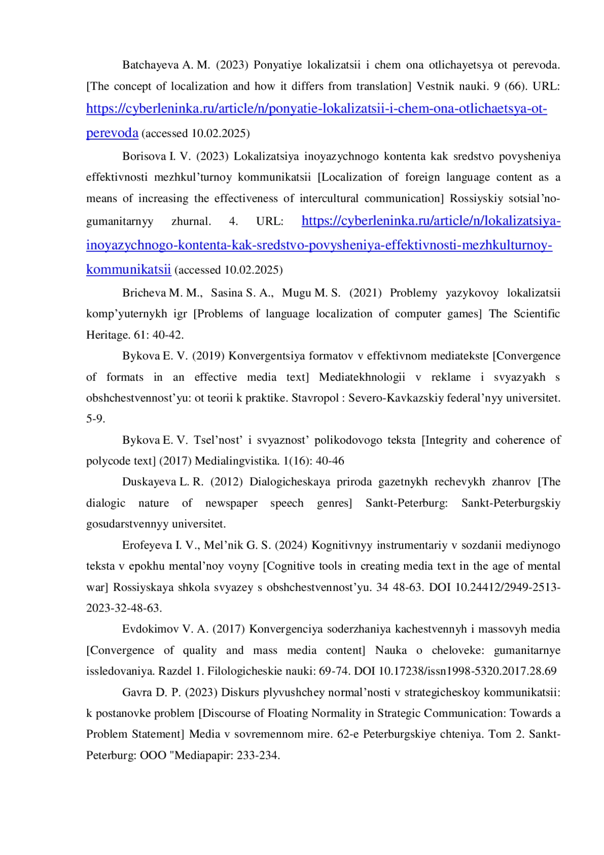 4. Борисова И. В. Локализация иноязычного контента как средство повышения эффективности межкультурной коммуникации // Российский социально-гуманитарный журнал. 2023. №4. URL: https://cyberleninka.ru/article/n/lokalizatsiya-inoyazychnogo-kontenta-kak-sredstvo-povysheniya-effektivnosti-mezhkulturnoy-kommunikatsii (дата обращения: 07.12.2024).