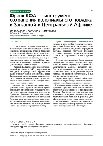 Цель настоящего исследования состоит в том, чтобы установить причины успеха Франции в сохранении зоны франка, а также в том, чтобы определить выгоды, которые получает Франция, и убытки, которые несут африканские страны от сохранения системы франка КФА.