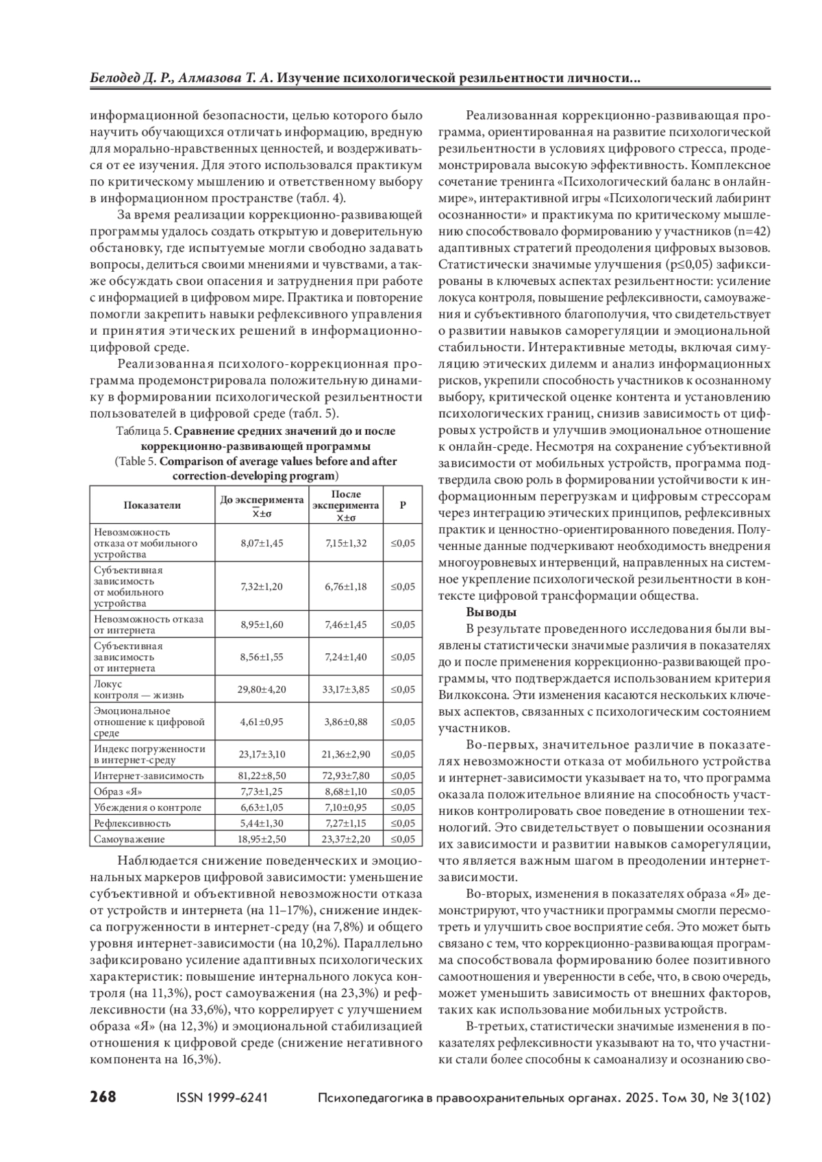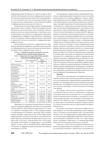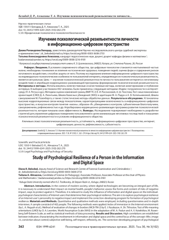 В условиях современного общества, где цифровые технологии становятся неотъемлемой частью жизни, необходимы понимание их влияния на психическое здоровье, поведение людей; оценка форм и содержания рисков негативного воздействия, способов защиты от него. Поэтому исследование влияния информационно-цифрового пространства на индивидуально-психологические особенности пользователей интернета, определяющих их психологическую резильентность, является актуальным. Цель — изучение психологической резильентности личности пользователя интернета к негативному воздействию и апробация коррекционно-развивающей программы формирования психологической резильентности. Материалы и методы. Использовались количественные и качественные методы, включая анкетирование и глубинное интервью. В выборке участвовали 402 человека. Были применены следующие методики: Индекс погруженности в интернетсреду (Л. А. Регуш и др.), Методика оценки изменений границ (МИГ-ТС-2) Е. И. Рассказовой, А. Ш. Тхостова, Тест смысложизненных ориентаций (СЖО) Д. А. Леонтьева, Шкала базисных убеждений (WAS) в адаптации М. А. Падун и А. В. Котельниковой, Шкала самоуважения М. Розенберга, а также статистические методы обработки данных. Результаты и обсуждение. Установлены высокие корреляционные связи между показателями, характеризующими вовлеченность в информационно-цифровое пространство, и локусом контроля понятия «жизнь», образом «Я», убеждением о контроле, субъективным благополучием, самоуважением, рефлексивностью и др. Апробирована коррекционно-развивающая программа развития психологической резильентности, которая показала свою эффективность. Выводы. Исследование подчеркивает необходимость разработки стратегий для управления цифровым поведением пользователей в целях минимизации негативных последствий и повышения психологической резильентности в условиях информационного общества.
