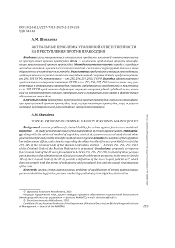 Введение: рассматриваются актуальные проблемы уголовной ответственности за преступления против правосудия. Цель - изложить проблемные вопросы квалификации преступлений против правосудия.