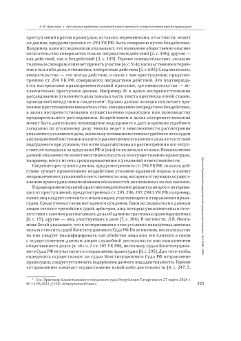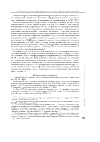 Выводы: сформулированы предложения по совершенствованию УК РФ: в ст. 295, 296, 297, 298.1 вместо иных лиц, участвующих в отправлении правосудия, указать арбитражных заседателей; в примечании к ст. 305 УК РФ представить дефиницию термина «неправосудный судебный акт», который не соответствует нормам материального и процессуального права и фактическим обстоятельствам дела.