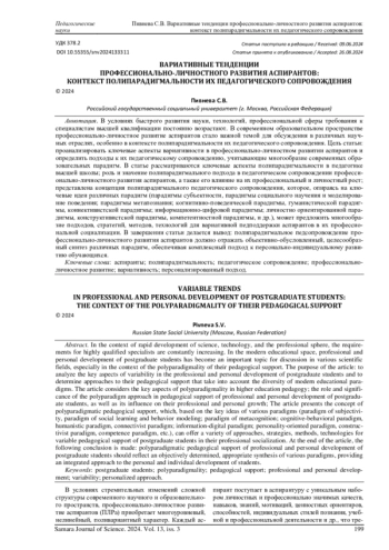 В условиях быстрого развития науки, технологий, профессиональной сферы требования к специалистам высшей квалификации постоянно возрастают. В современном образовательном пространстве профессионально-личностное развитие аспирантов стало важной темой для обсуждения в различных научных отраслях, особенно в контексте полипарадигмальности их педагогического сопровождения. Цель статьи: проанализировать ключевые аспекты вариативности в профессионально-личностном развитии аспирантов и определить подходы к их педагогическому сопровождению, учитывающие многообразие современных образовательных парадигм. В статье рассматриваются ключевые аспекты полипарадигмальности в педагогике высшей школы; роль и значение полипарадигмального подхода в педагогическом сопровождении профессионально-личностного развития аспирантов, а также его влияние на их профессиональный и личностный рост; представлена концепция полипарадигмального педагогического сопровождения, которое, опираясь на ключевые идеи различных парадигм (парадигмы субъектности, парадигмы социального научения и моделирование поведения; парадигмы метапознания; когнитивно-поведенческой парадигмы, гуманистической парадигмы, коннективистской парадигмы; информационно-цифровой парадигмы; личностно ориентированной парадигмы, конструктивистской парадигмы, компетентностной парадигмы, и др.), может предложить многообразие подходов, стратегий, методов, технологий для вариативной педподдержки аспирантов в их профессиональной социализации. В завершении статьи делается вывод: полипарадигмальное педсопровождение профессионально-личностного развития аспирантов должно отражать объективно-обусловленный, целесообразный синтез различных парадигм, обеспечивая комплексный подход к персонально-индивидуальному развитию обучающихся.