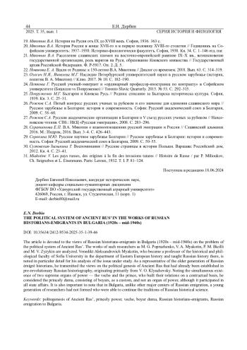 Статья посвящена взглядам русских историков-эмигрантов в Болгарии (1920-х - сер. 1940-х гг.) на проблему политического строя Древней Руси. Анализируются труды таких исследователей, как М. Г. Попруженко, В. А. Мякотин, П. М. Бицилли и М. В. Зызыкин. Особенно подробно отметился разбором изучаемого вопроса Венедикт Александрович Мякотин, ставший профессором историко-филологического факультета Софийского университета по кафедре истории Восточной Европы и преподававший здесь Русскую историю. Как представитель старшего поколения русских историков-эмигрантов, он транслировал уже устоявшиеся в дореволюционной отечественной историографии взгляды на политогенез Древней Руси, исходящие, прежде всего, от В. О. Ключевского. Отмечая одновременное существование двух верховных органов власти - веча и князя, строивших свои отношения на договорном начале, княжескую думу, состоявшую из бояр, он рассматривал как обычай, а не орган власти, хотя и участвующую во всех государственных делах. Важно также отметить, что в Болгарии, в отличие от других крупных центров русской эмиграции, не сформировалось молодого поколения исследователей, сумевших продолжить традиции русской исторической науки.