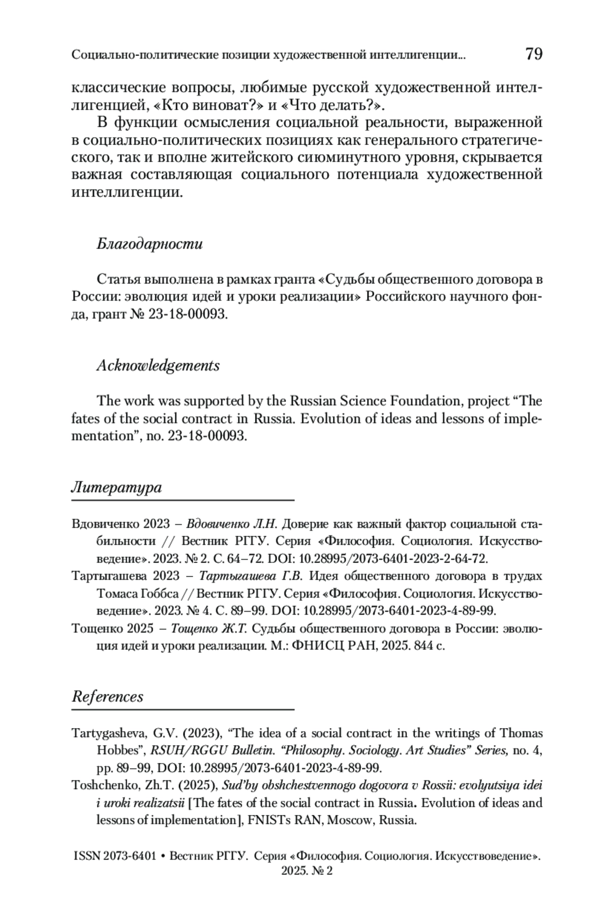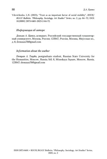 1. Вдовиченко 2023 - Вдовиченко Л.Н. Доверие как важный фактор социальной стабильности // Вестник РГГУ. Серия «Философия. Социология. Искусствоведение». 2023. № 2. С. 64-72. https://doi.org/10.28995/2073-6401-2023-2-64-72.