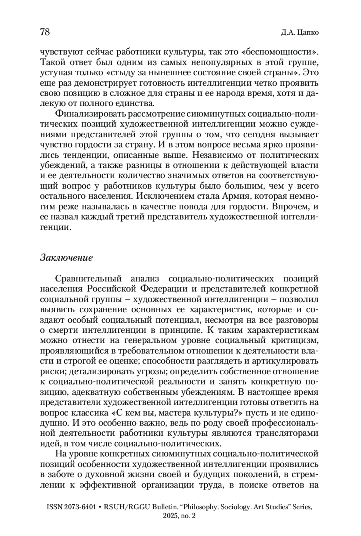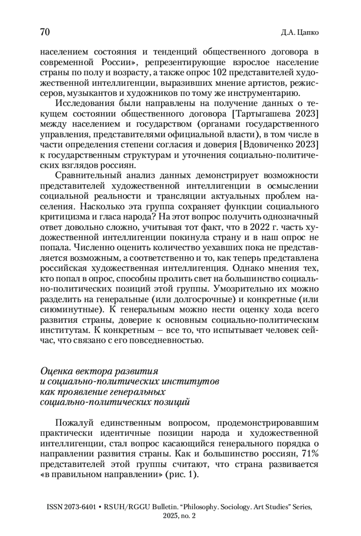 Социальный потенциал художественной интеллигенции рассматривается через социально-политические позиции ее представителей, являющиеся результатом критического осмысления ими социальной реальности. Такое осмысление само по себе является важной процедурой для жизни общества, а возможности художественной интеллигенции применительно к нему имеют особые свойства, способные не только точно улавливать еще неочевидные риски, но и распространять конкретные социальные реакции посредством собственной творческой деятельности, зачастую носящей массовый характер. Результаты специализированного опроса, выявляющего социально-политические позиции художественной интеллигенции в сравнении с позициями всего населения, позволяют выявить ее роль в критическом осмыслении социальной реальности, и в этом смысле обозначить социальной потенциал этой группы.