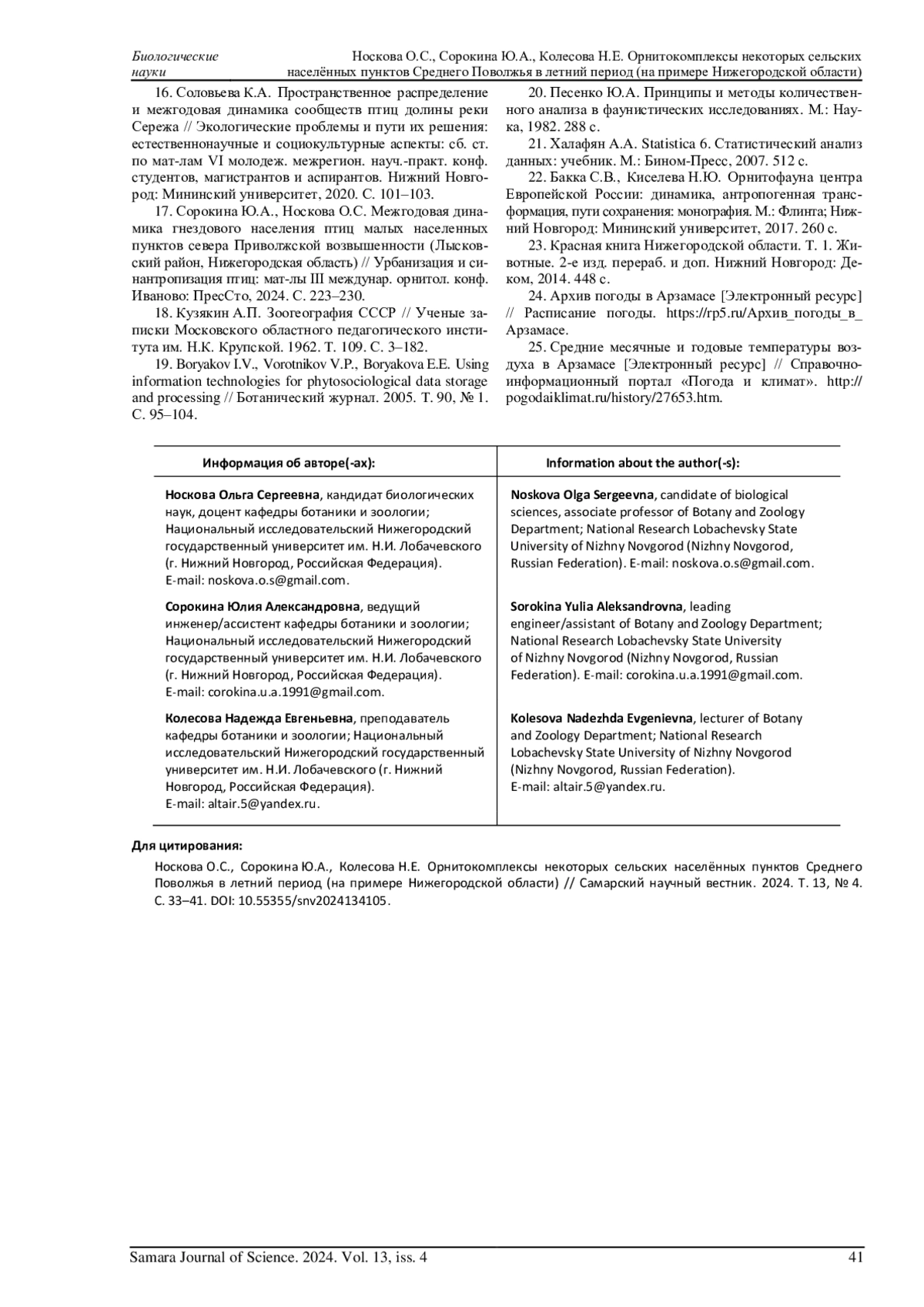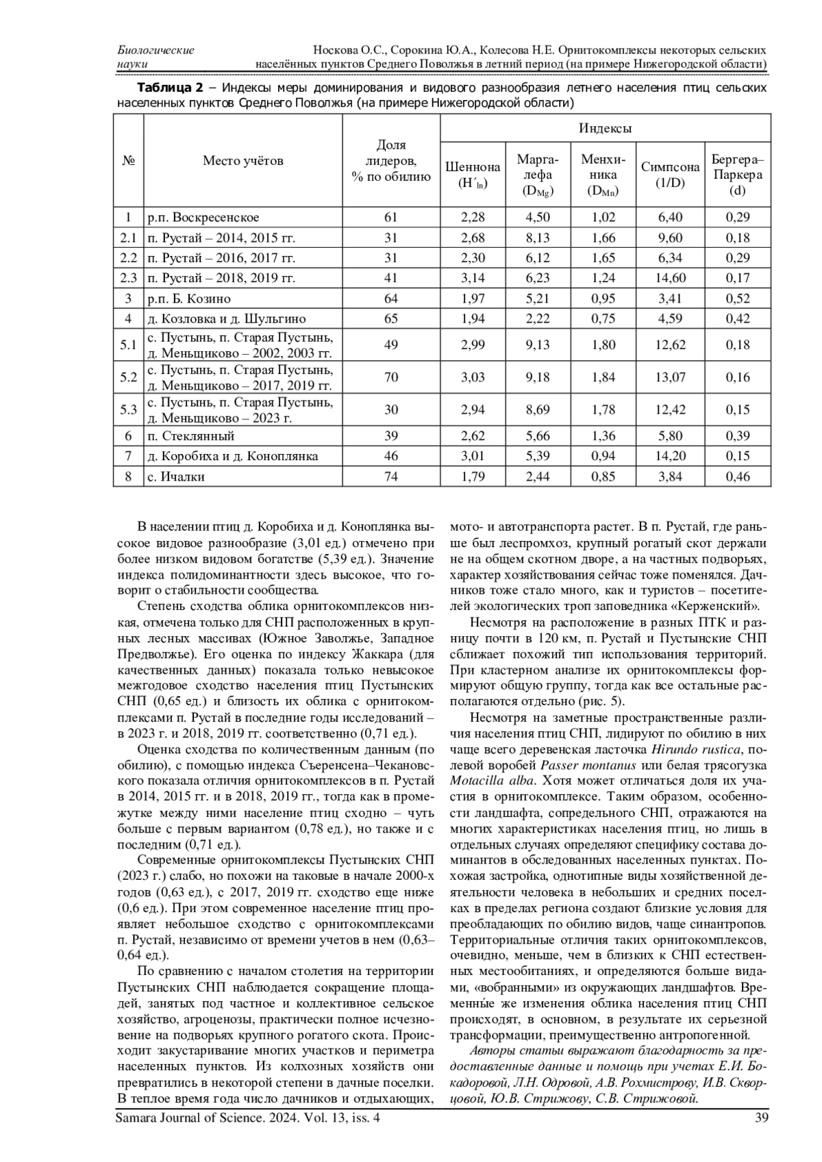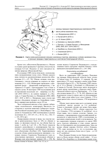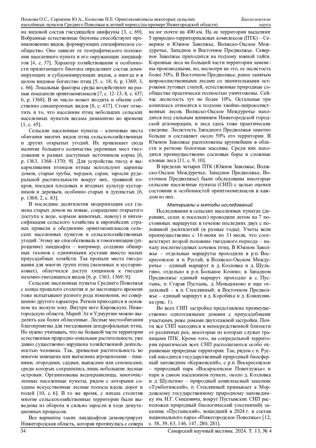 НОСКОВА О. С., СОРОКИНА Ю. А., КОЛЕСОВА Н. Е. ОРНИТОКОМПЛЕКСЫ НЕКОТОРЫХ СЕЛЬСКИХ НАСЕЛЁННЫХ ПУНКТОВ СРЕДНЕГО ПОВОЛЖЬЯ В ЛЕТНИЙ ПЕРИОД (НА ПРИМЕРЕ НИЖЕГОРОДСКОЙ ОБЛАСТИ) // САМАРСКИЙ НАУЧНЫЙ ВЕСТНИК. 2024. ТОМ 13, № 4