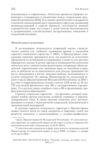 В статье рассматривается феномен скрытого социального сиротства в Приднестровье, который остается недостаточно изученным в социологических исследованиях республики. Автор акцентирует внимание на теоретико-методологических основах, предлагая использовать концепцию латентных социальных процессов, разработанную Э. Дюркгеймом. В исследовании выявлено, что скрытое социальное сиротство охватывает детей, находящихся в семьях с недостаточной социальной и эмоциональной поддержкой, что негативно сказывается на их интеграции в общество. Обсуждаются факторы скрытого социального сиротства, включая аномию, девиантное поведение и снижение уровня доверия к социальным институтам.