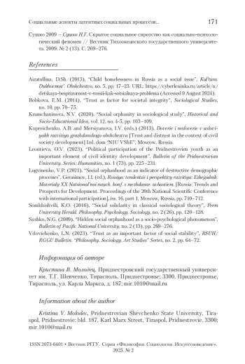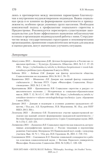 3. Вдовиченко 2023 - Вдовиченко Л.Н. Доверие как важный фактор социальной стабильности // Вестник РГГУ. Серия «Философия. Социология. Искусствоведение». 2023. № 2. С. 64-72.