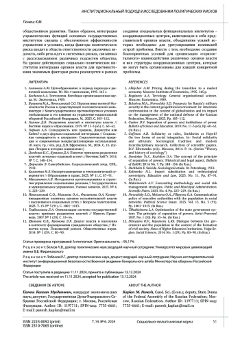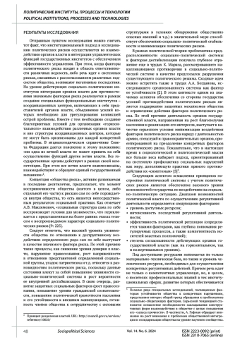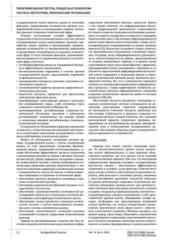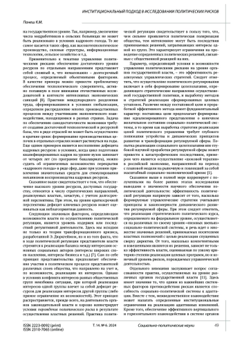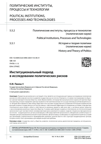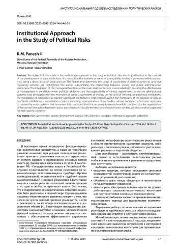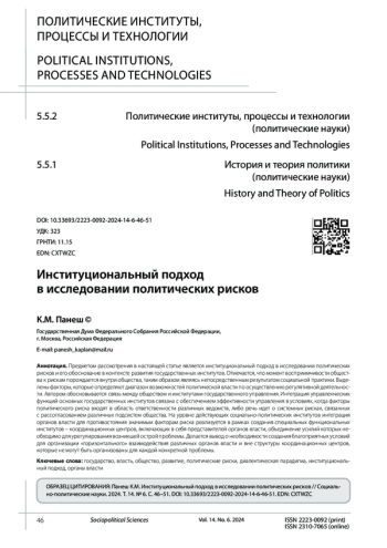 Предметом рассмотрения в настоящей статье является институциональный подход в исследовании политических рисков и его обоснование в контексте развития государственных институтов. Отмечается, что момент восприимчивости общества к рискам порождается внутри общества, таким образом являясь непосредственным результатом социальной практики. Выделены факторы, которые определяют диапазон возможностей политической власти по осуществлению регулятивной деятельности. Автором обосновывается связь между обществом и институтами государственного управления. Интеграция управленческих функций основных государственных институтов связана с обеспечением эффективности управления в условиях, когда факторы политического риска входят в область ответственности различных ведомств, либо речь идет о системных рисках, связанных с рассогласованием различных подсистем общества. На уровне действующих социально-политических институтов интеграция органов власти для противостояния значимым факторам риска реализуется в рамках создания специальных функциональных институтов - координационных центров, включающих в себя представителей органов власти, объединение усилий которых необходимо для урегулирования возникшей острой проблемы. Делается вывод о необходимости создания благоприятных условий для организации «горизонтального» взаимодействия различных органов власти и вне структуры координационных центров, которые не могут быть организованы для каждой конкретной проблемы.