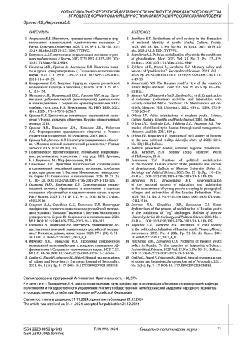 12. Смирнов В.А., Скрябина О.Б., Бессонова Т.И. Некоторые дисфункции процесса социализации российской молодежи в условиях “больших” вызовов // Вестник Московского университета. Серия 18: Социология и политология. 2022. № 1. DOI: 10.24290/1029-3736-2022-28-1-110-125 EDN: DEHPJL